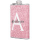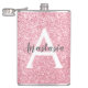 Chic and glam blush pink rose gold glitter sparkles metallic flask, with a large, white monogram initial and your custom name in an elegant grey script font. Personalize this trendy flask with your name or monogram initial. You can change the text colour and font style and size using the customize option.