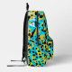 This cool, youthful backpack features a colourful trendy design with orange, black, turquoise leopard spots pattern allover, and a white customizable name on the top with a large bold script.