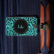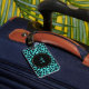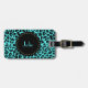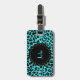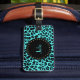 Pretty custom luggage tag done in a turquoise and black leopard print. Graphics of a black circular disc, in the middle, has turquoise text ready to personalize. The back is done in solid black, on the bottom and graphics of a turquoise leopard pattern, at the top. Personalize the text, on the front and back. Fashionable tag for luggage, backpacks, or purses.