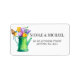 Formal return address labels featuring a beautiful watering can full of yellow daffodil and pink and purple tulips in elegant watercolor. Perfect for a wedding or bridal shower.