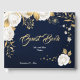 beautiful elegant white flowers with some gold leaves chic navy blue guest book.