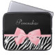 Get your fashionista on with this chic and stylish animal print 15 inch Laptop Sleeve. This fashion accessory has a trendy black and white zebra print and a soft feminine light pink ribbon tied into a cute girly bow. Personalize by adding the name of your teen girl. Flat printed image, not actual ribbon. Original Art copyright of ©OhSoGirly
