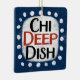 A fun and cute typographic message design that says "Chi Deep Dish". It has black and red text on a white rectangle with funky, playful white dots surrounding it, all on a blue background.