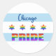 This Chicago PRIDE design combines the elements of the Chicago flag with the LBGTQ rainbow colours. The word Chicago is in a blue script type font. The four stars and the word "PRIDE" are in the rainbow colours.
