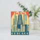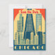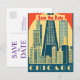 Chicago, Illinois save the date invitation card. Recognizable buildings.