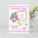 A children's kindergarten or preschool graduation party photo invitation with my digital artwork of a cute little chicken holding a bunch of colourful balloons with graduation caps.