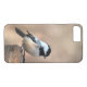 This iPhone 7 case features a Black-capped Chickadee (Poecile atricapillus) with black and white feathers and a rust coloured belly perched on the edge of a wooden feeder, bathed in the golden orange light of sunset.