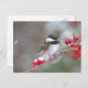 Chestnut-backed chickadee photo of the small bird sitting on a branch with red berries and snow falling.