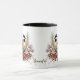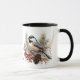 This is a pretty mug for anyone, with the image of a pert little chickadee perched on a pine branch with a pine cone and red berries. Behind the bird images is a trail of a gold swirl. The image is repeated twice on the mug, with your name in black between them. A pretty scene for any season!