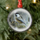 A tree ornament with a photograph of a black-cappped chickadee.