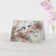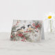 A charming scene of chickadees perched on a lush evergreen branch, surrounded by red berries and delicate snowflakes. The vintage grey textured background adds a timeless touch.