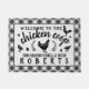 "Welcome to the chicken coop" text with 4 chicken silhouettes (1 hen, 1 rooster, 2 pullets / chicks), plus a leaf wreath and eggs. Add your family name to this chic rustic farmhouse doormat with a black / white / grey check buffalo plaid frame and black silhouettes - perfect for farmers and chicken lovers.