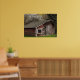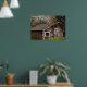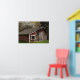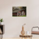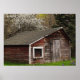 This scenic fine art poster features a rural country scene with an old wood chicken coop with weathered red wooden barn board and white trim around the window set on a lovely green lawn and an evergreen tree behind. The apple tree with white and pink flowers tells us it is spring.