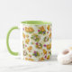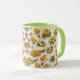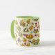 White and lime 11 oz. combo mug with an image of downy yellow chicks, pink eggs in green nests, and pretty pink, blue, purple and yellow flowers. See matching paper plate and square ceramic tile. See the entire Easter Mug collection under the HOME category in the HOLIDAYS section.