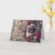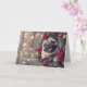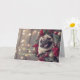 Cette mignonne carte de Noël présente un adorable chien de carlin qui met la tête à travers une couronne, avec un bel arrière - plan de bokeh. Vous pouvez customiser à la fois l'accueil sur le devant et le message à l'intérieur de la carte à votre goût.