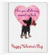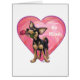 Parade d'animaux Chihuahua Chig romantique Personnalisé Heart and Love Big Card présente notre oeuvre d'art amusante d'un Chihuahua noir et bronze tenant une rose rouge dans sa bouche avec des coeurs violets, rouges et roses superposés derrière les mots Be Mine. À l'intérieur, vous verrez le chien mignon de derrière avec les mots personnalisables, je vous aime tout autour de mon dos. Ce doux chien en amour design est un cadeau parfait pour la Saint Valentin, son anniversaire, pour proposer le mariage d'une manière amusante et originale, ou simplement pour dire, je vous aime. Malheur ! La romance est dans l'air.