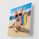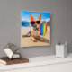 This cute photo features a chihuahua dog at the beach carrying a rainbow colored Gay Pride flag.