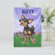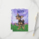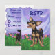 Animal Parade Playful Chihuahua Dog RSVP Customizable Kids Birthday RSVP Card brought to you by Imagine That! Design features our cute black and tan Chihuahua standing on a grassy yard with a beautiful blue and purple etxtured sky and a playful wavy purple border. You’ll find this fun heads and tails canine painted by our talented children’s illustrator, Traci Van Wagoner, on coordinating invitations, cards, party favours and much more. Much of our fun party gear shows both sides of the cute Chihuahua, head and butt, in colourful, fun art that will bring a smile to the face of any animal lover, Chihuahua lover, or small dog lover. Anyone who loves dogs will be delighted to use this playful pup for their fun animal themed party. On the invitation, you’ll find the funny pup coming and going with this fun artwork of the dog's head on the front and the funny Chihuahua’s tail on the back with all the customizable party information. Party on with this adorable black and tan dog! Woof!