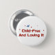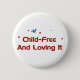 Are you Child-Free and Loving It? Here's your design that announces it with big red letters, a bluebird of happiness, and red hearts. Words say: "Child-Free and Loving It."