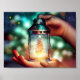 Small child's hands holding a Christmas lantern with a Christmas tree glowing inside it. A blurred holiday light background. Evokes sentimental feelings of being a child at Christmas time.