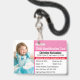This child identification card is perfect for your child. It contains pink colouring, along with black text on the front for address, stats such as height, weight, blood type and date of birth. There is also room to add emergency contact numbers and names. Replace the template image with that of your child as well!