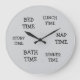 Funny children's clock with daily schedule. This novelty clock can be used in bedrooms or nurseries. Clock design is grey colour with black text. Written text includes: DINNER TIME, NAP TIME, STORY TIME, BATH TIME, BED TIME AND LUNCH TIME. You have the ability to change the clock colour to match your decor.