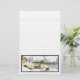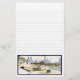 Lined stationery with a vintage illustration from a storybook of a child laying on the sand at the beach. His dog swims far out in the waves.