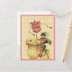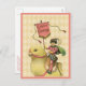 A redesigned vintage illustration of a child riding and giant chick, carrying an Easter Greetings banner. Add a return address and text on the reverse.