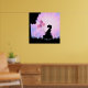 Beautiful silhouette of a little girl with pink balloons and pink butterflies against a pink and purple sunburst background office wall art print.