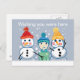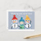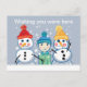 Cute snowmen in beanies and child looking a little wistful while snow is falling