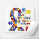 A puzzle piece that reads 'I Love a Child With Autism", puzzle pieces of blue, red, and yellow and the autism awareness ribbon on autism awareness T-shirts, hoodies, mugs, magnets, cards, stickers, bags, keychains, buttons, and other items.