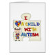 A big puzzle piece, a heart composed of puzzle pieces, a stick figure brunette haired girl, and text that reads "I Love a Child With Autism" on autism awareness T-shirts, mugs, cards, stickers, tote bags, magnets, keychains, journals, mousepads, and other apparel and gift items.