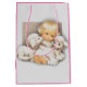A cute lovely blonde child surrounded by white lambs. Change text to suit your needs!