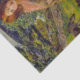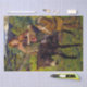 This design features a painting by the British Victorian artist John Lee (active 1850–1870), who worked in a Pre-Raphaelite style. It depicts two children, a girl and a boy, travelling to market in a beautiful rural landscape. The girl is riding on the back of a donkey, and she is carrying wooden baskets, which will hold the produce bought at market. The boy is walking alongside his sister and her donkey; he is carrying a bag on his back. They are travelling through a farmer's field, and an animal can be seen grazing on the grass in the background. Further back there are tall trees and mountains. The mountainous landscape and the children are possibly both intended to be Welsh.