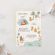 Children's birthday invitation with a camping theme. Features animals like a fox and bear, tent, and campfire. Text reads “Adventure awaits” and gives event details.
