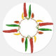 The New Mexico state zia symbol is represented here in New Mexico fashion with a red, chile, a green chile, a habanero pepper, and a banana pepper.