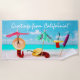 Three red chili peppers on the beach. Hot sunny day, blue sea, white sand, umbrellas, and sombreros. Two peppers are drowsy under beach umbrellas, the third one is waist-deep in the water. Every hour is a happy hour at the beach. Sun, Sea, Sand, Sombrero. White text Greetings from California! Funny customizable beach towel. You can change the image and you can change or delete the template text. Have fun and enjoy summer vacations!