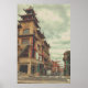 The image captures a street view in San Francisco Chinatown, featuring traditional Chinese architecture. A multi-story building with a pagoda-style roof is prominently displayed. Red lanterns are strung across the street, adding to the cultural ambiance. The sky is overcast, casting a soft light on the scene.