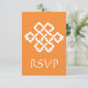 This elegant RSVP card features a bright orange background and a large Chinese good luck knot in white on the front. An orange border along the bottom edge of the card with a white geometric pattern inspired by Chinese ornamentation decorates the back with some sample text in place above that can be customized to fit your needs.