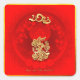 Golden Rabbit paper-cut into a decorated circle with Chinese lantern and Fu ideogram (meaning Luck), blossoms and Chinese greeting into small circles under the Rabbit + "Year of the Rabbit" in hand writing style onto a golden textured paper (image printed). Design on square sticker for Chinese New Year of the Rabbit 2023. Matching greeting card, postcard, square flat card, party supplies and more...