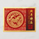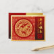 An elegant visual of a golden horse with blossoms into a circle (inspired by traditional Chinese paper-cut) with red circle overlay a red and yellow traditional Asian pattern + graphic "HAPPY NEW YEAR" in Chinese and English and old Chinese calligraphy for "horse" on the right on gradiant red colour band. On the back are the same gradiant background (on the left) for texts to personalize: your message and return address + golden textured paper (image printed) on the right. Design on horizontal holiday postcard. You can easily personalize this Lunar New Year postcard by customizing the greeting on the back or delete for your handwritten note, type in your return address. Matching real foil holiday postcard.