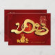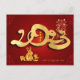 Chinese firecrackers as background for a large golden 2023 with greeting in Chinese inside the number + "HAPPY CHINESE NEW YEAR" and golden paper-cut (printed image) of a rabbit. Design on horizontal holiday postcard with the same background in back. Matching greeting card, invitation, and more soon...