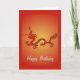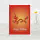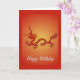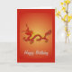 This greetings card features a red and golden dragon against a background of red with a golden sunburst. The dragon has a thin curved body with yellow gold spines along its back and tail. It has sharp claws at the end of its feet, horns and sharp teeth. The dragon commemorates celebrations on or around the Chinese New Year, the Year of the Dragon in 2024, but an eye-catching card throughout the year.