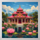 Beautiful traditional Asian-style pavilion surrounded by a serene pond filled with pink lotus flowers, with lush greenery and mountains in the background under a bright blue sky.