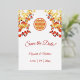 Red cherry blossoms and a real gold foil double happiness symbol on a white background. Save the date text in an elegant font. Matching Chinese wedding products available.