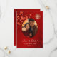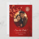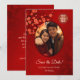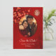 Red cherry blossoms and a red double happiness symbol on a shimmering ruby red background. Save the date text in an elegant script. Customize it with your photo. Matching Chinese wedding products available.