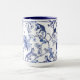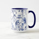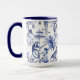 Refresh your drink ware collection. Elegant and whimsical repeating blue and white chinoiserie toile pattern of flowers , monkeys and tigers on a two tone mug. Great for new apartment and housewarming gift.
