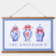 This chic door mat features 3 different ginger jars with red bows. The border around the card is a blue border. You can personalize with your name.