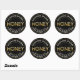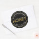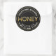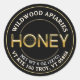 Label your own honey, candles, beeswax and more with this modern black and metallic gold honey sticker. Personalize with your apiary business name at the top and add in your location or and NET WT below. The word HONEY is printed with a raised-look in a shiny metallic gold "chiseled" font that almost appears as if it is coated with honey. The centre of the letter "O" in HONEY is filled with honeycomb.