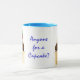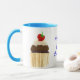 Un Ringer Mug blanc avec une jante bleu poudre et une poignée avec un cupcake au chocolat de chaque côté, surmonté d'une fraise et crème. 'N'importe qui pour un cupcake' est écrit entre les deux cupcakes en bleu. Le dessin est tiré d'un collage de papier peint à la main par Judy Adamson. Vous pouvez également être intéressé par d'autres modèles de cupcake de Judy Adamson sur des cartes de voeux et des T-shirts.
